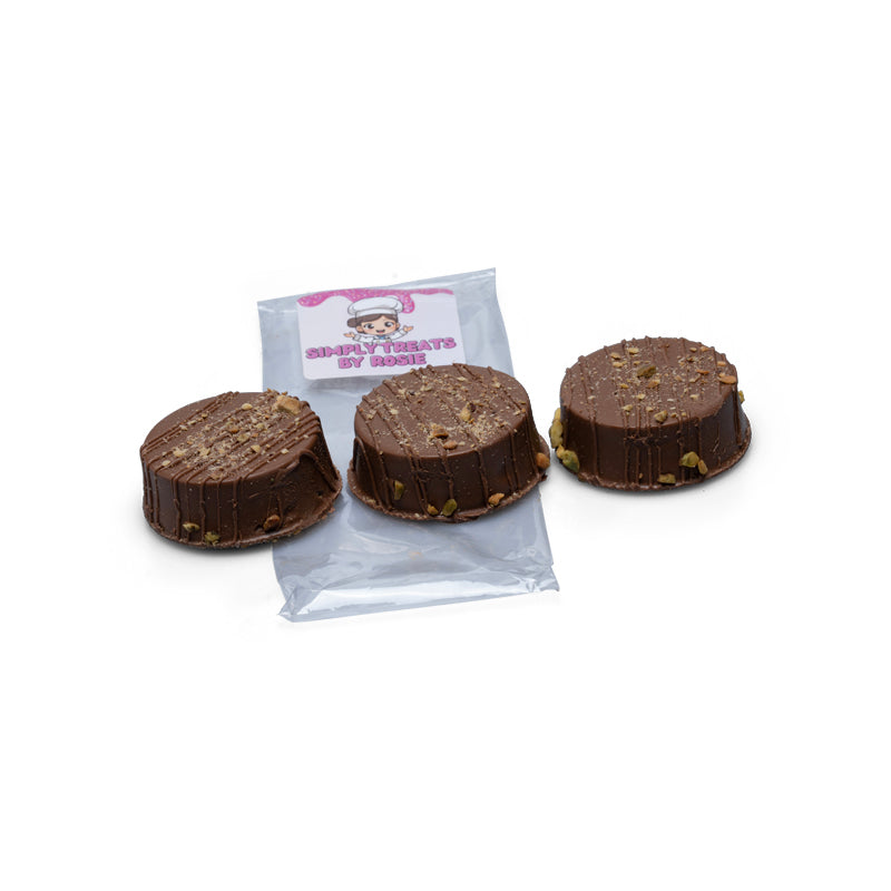 Carmela's dubai bites take on a powerful mixture of toasted kataifi with pistachio creme imulged in our rich milk chocolate, topped with chopped pistachios.