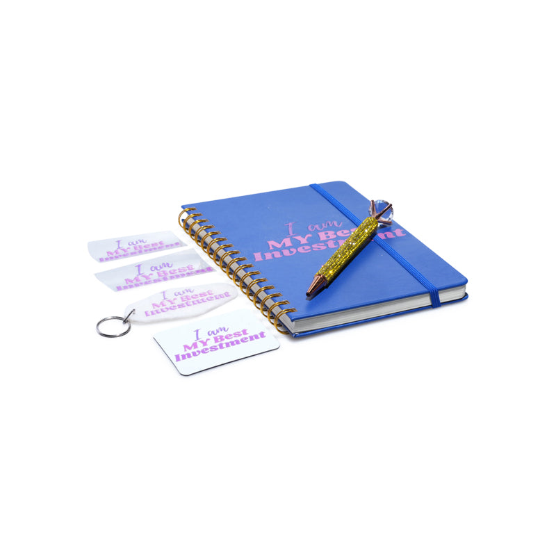 Celebrate self-worth and growth with the “I Am MY Best Investment” bundle. Includes a motivational journal, bedazzled pen, matching keychain, decorative magnet and UV decal stickers. Designed to inspire focus, self-care and confidence—perfect for students, professionals or anyone embracing their journey.