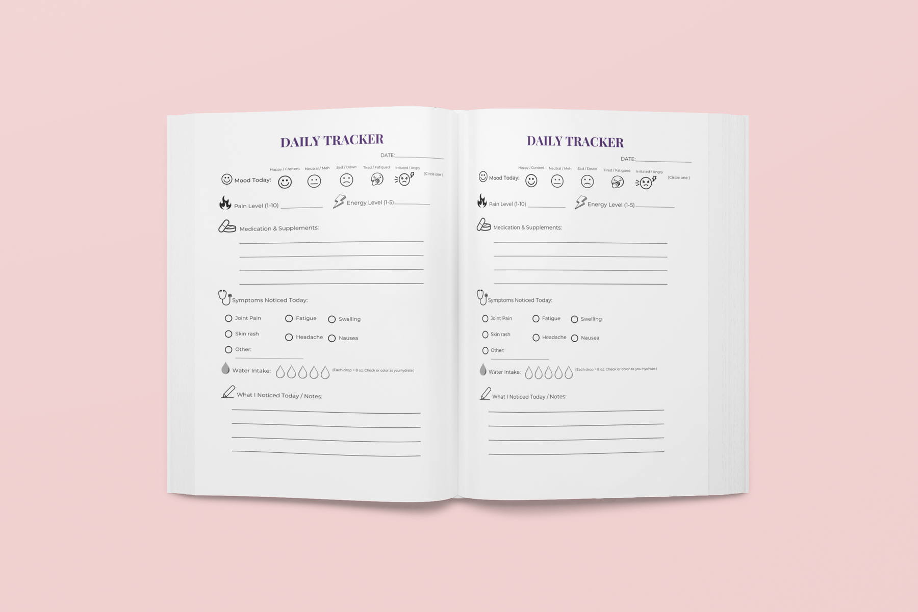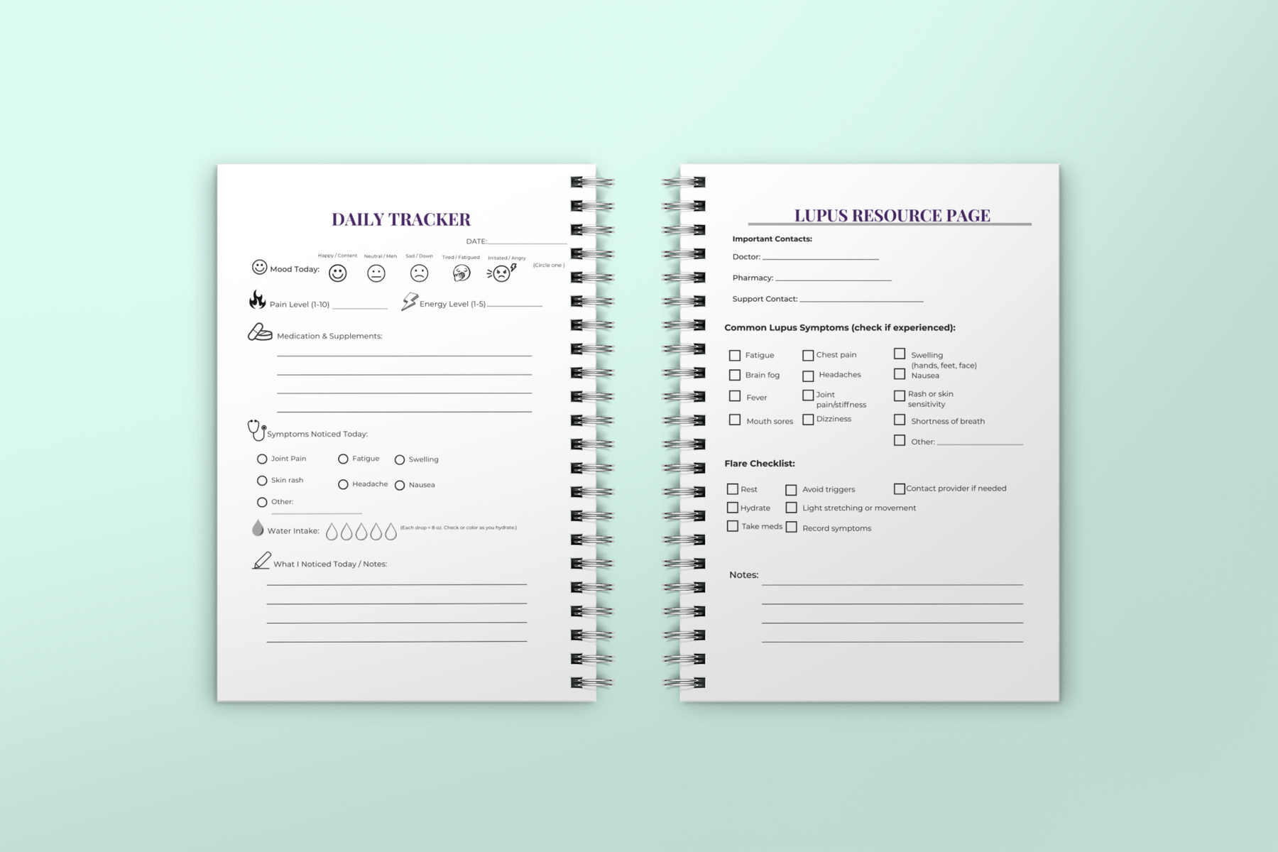 The Lupus in Focus Journal is a spiral bound, 6 x 9-inch logbook with 80 pages, designed for an 8-week journey of symptom tracking and daily wellness support.